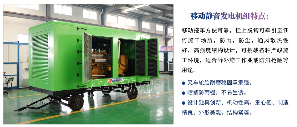 移動(dòng)靜音發(fā)電機(jī)組特點(diǎn): 移動(dòng)拖車方便可靠,掛上脫鉤可牽引至任何施工場所,防雨,防塵,通風(fēng)散熱性好,高強(qiáng)度結(jié)構(gòu)設(shè)計(jì),可挑戰(zhàn)各種嚴(yán)峻施工環(huán)境,適合野外施工作業(yè)或防汛搶險(xiǎn)等用途。